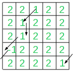 Complicating Mylar's life is the fact that there may be a different fuel cost associated with traversing each cell in the grid. Here is an example grid along with the optimal sequence of decisions (with a total fuel cost of 5):