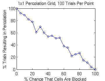 If you are interested, there are many other experiments you could run using this system: how exactly does the size of the grid change the sharpness of the threshold? Does the shape of the grid matter? In other words, would the probability of percolation be the same for a 100x100 grid as for a 20x500 grid (both have 10,000 entries)?